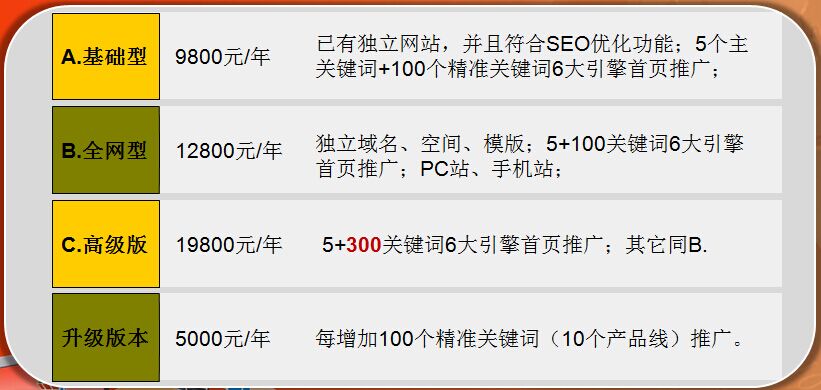 備注: 1、以上價格不包含網站制作及上傳產品資料,如需上傳產品資料及制作圖片,公司將收1000元制作成本(包含50個產品資料),如要上傳更多,按一個產品20元算;如果企業(yè)要個性化制作網站,價格另談. 2、5+100關鍵詞推廣為全包服務,客戶無需再做其它操作,無需培訓,效果即查即看。 3、通科云盟系統(tǒng)需要客戶提供FTP密碼、網站后臺密碼,這是前提! (通科云盟推廣價格--首創(chuàng)5+100關鍵詞百度等搜索引擎首頁排名推廣;主關鍵詞+精準關鍵詞雙線出擊;100精準關鍵詞推廣、多關鍵詞推廣方法、百度關鍵詞推廣、SEO優(yōu)化推廣方法、全網營銷推廣) |