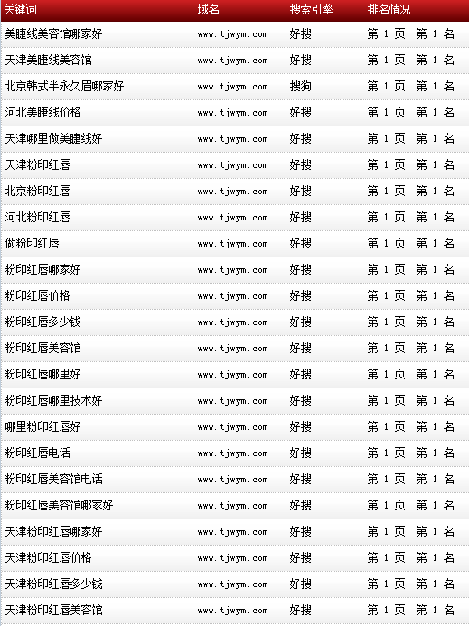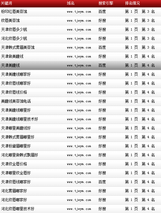 各關(guān)鍵詞在各大搜索引擎排名情況: